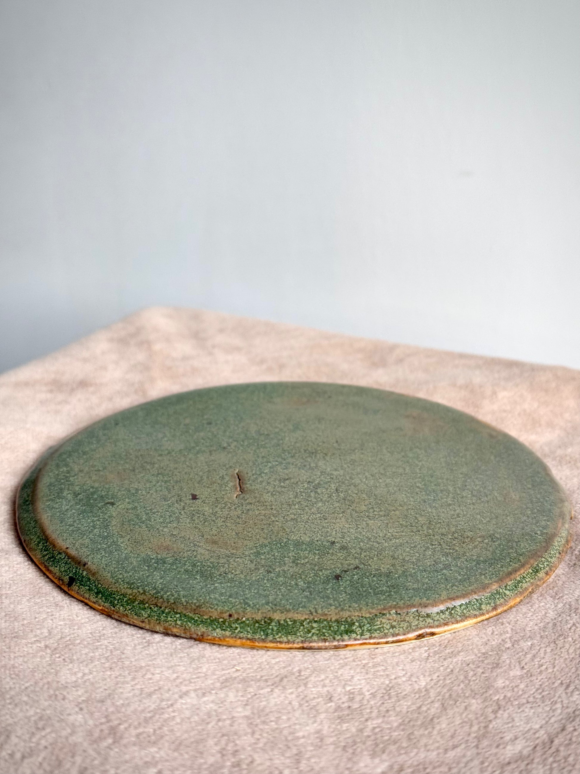 Een plateau met een donker groene kleur. Leuk om kaarsen op te zetten, of misschien wel als kaasplateau! Diameter is 14,5 cm.