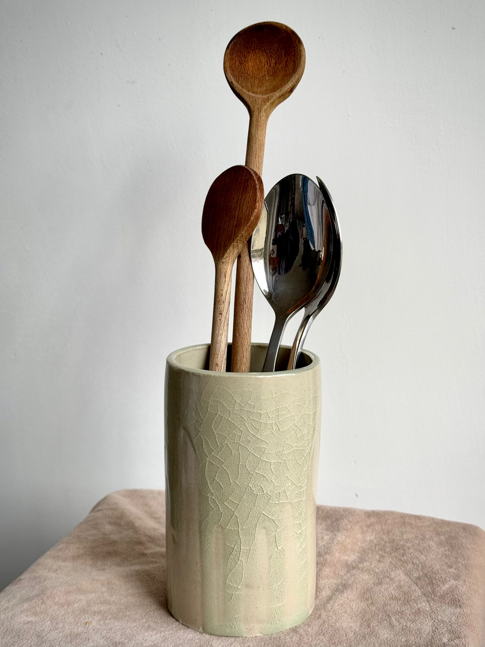Een pollepelhouder met een hoogte van 13,5 cm. Waarbij er met een glazuur overheen is gedropen waardoor op veel plekken de onderliggende kleikleur nog steeds zichtbaar is. Dit maakt hem qua kleurencombinatie heel natuurlijk.