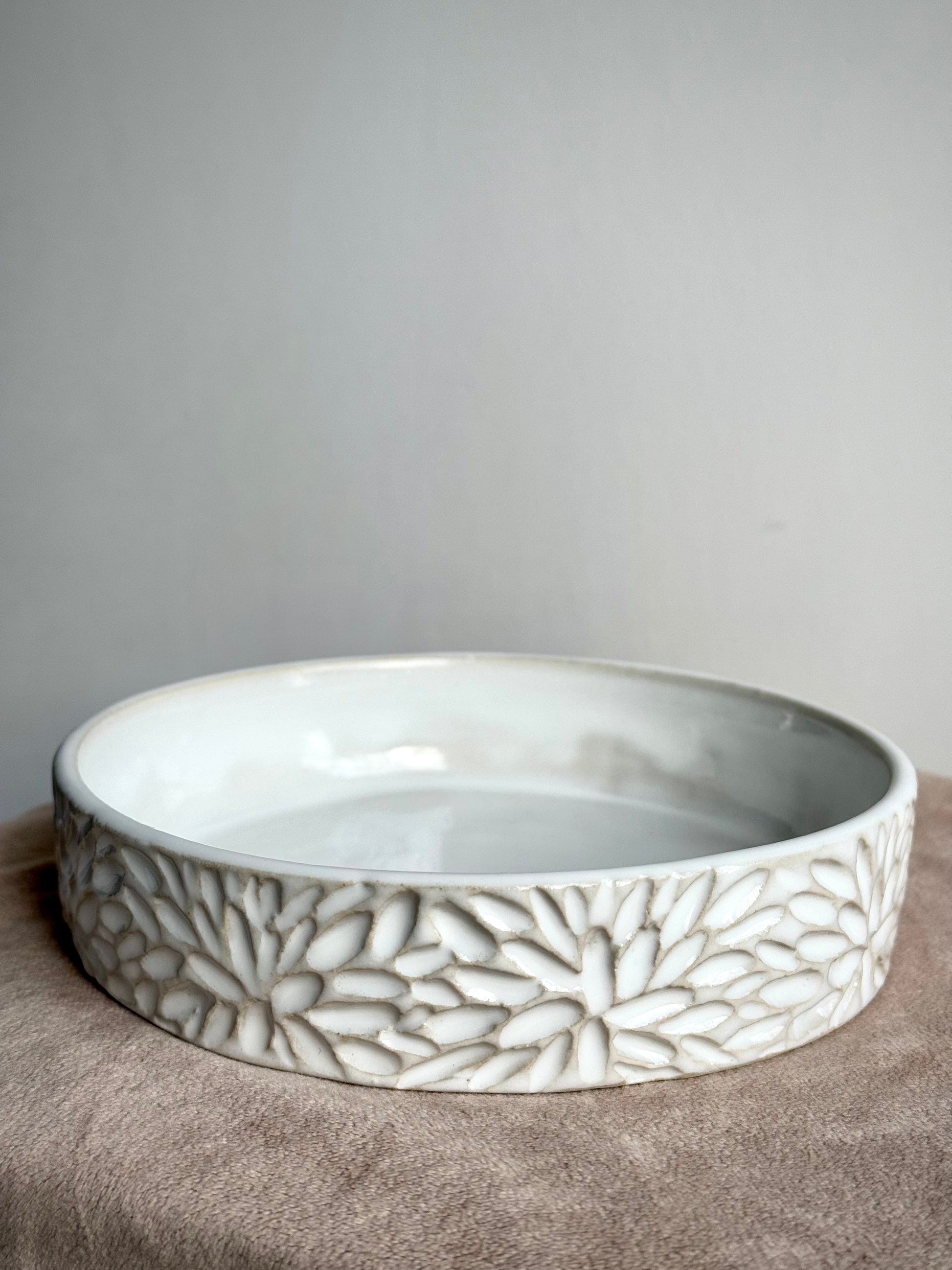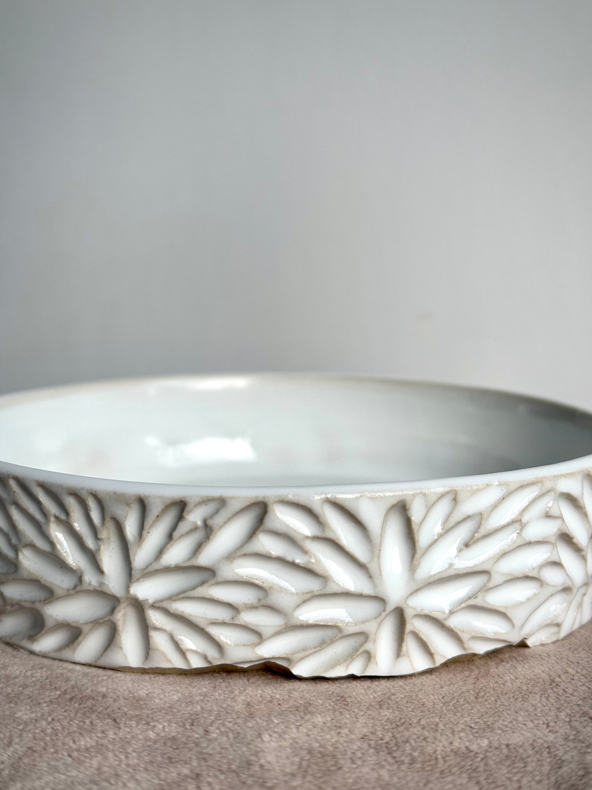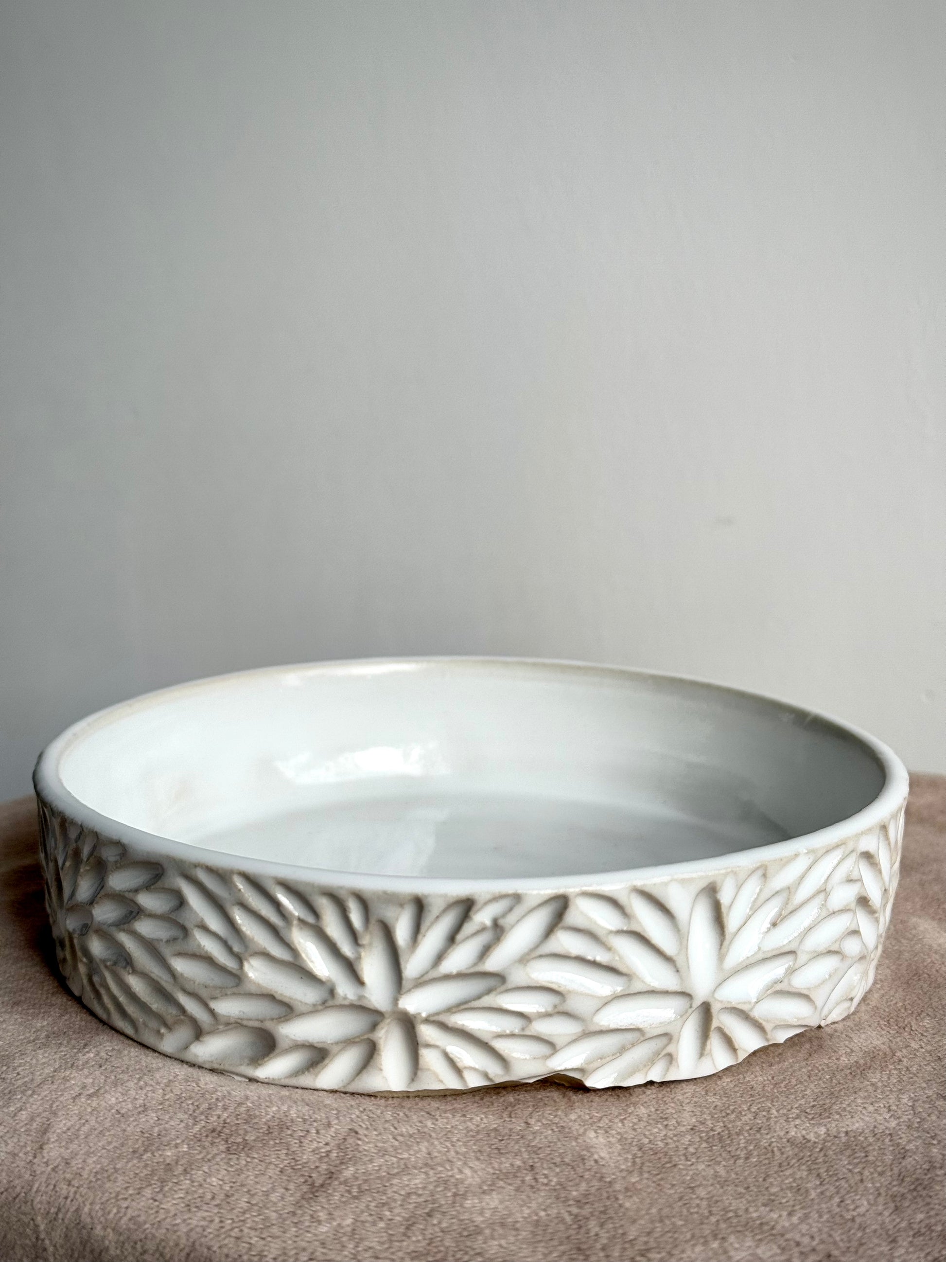 Naast de twee kleine bakjes is er ook een grotere schaal met als inspiratie de stralen van de zon. Simpel van kleur, maar door het reliëf van de zonnestralen, bijzonder qua ontwerp. Ook hierbij mist een deel van het onderrandje (zie de laatste foto), dit maakt het wel weer een speelsere schaal.